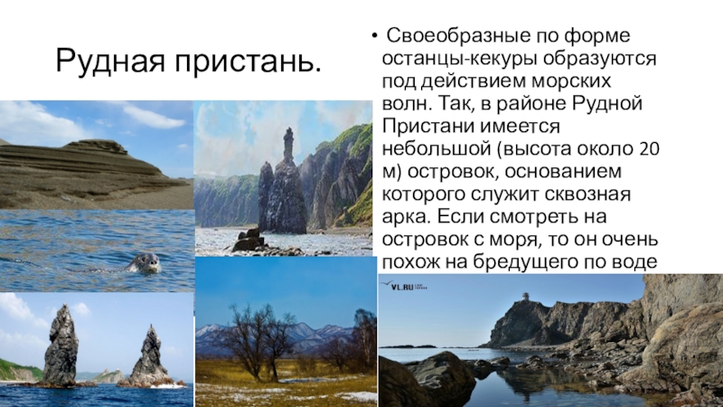 Так, в районе Рудной Пристани имеется небольшой (высота около 20 м) островок, основанием которого служит сквозная арка. Если смотреть на островок с моря, то он очень похож на бредущего по воде мамонта