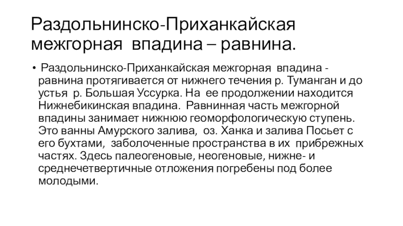 нижнего течения р. Туманган и до устья р. Большая Уссурка. На ее продолжении находится Нижнебикинская впадина. Равнинная часть межгорной впадины занимает нижнюю геоморфологическую ступень. Это ванны Амурского залива, оз. Ханка и залива Посьет с его бухтами, заболоченные пространства в их прибрежных частях. Здесь палеогеновые, неогеновые, нижне- и среднечетвертичные отложения погребены под более молодыми.