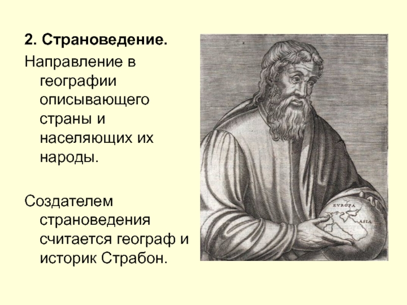 2. Страноведение. Направление в географии описывающего страны и населяющих их народы. Создателем страноведения считается географ и историк