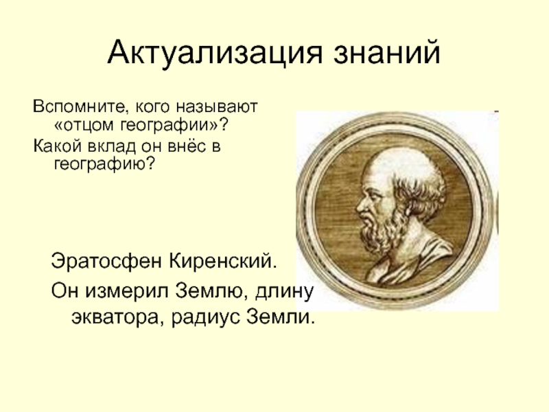Актуализация знанийВспомните, кого называют «отцом географии»?Какой вклад он внёс в географию?Эратосфен Киренский.Он измерил Землю, длину экватора, радиус