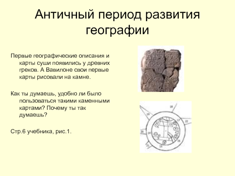 Античный период развития географииПервые географические описания и карты суши появились у древних греков. А Вавилоне свои первые