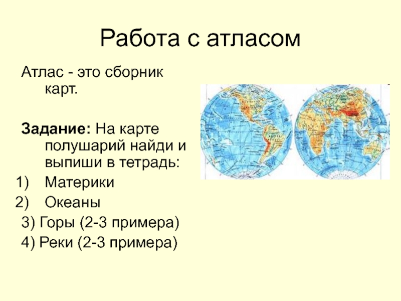 Работа с атласомАтлас - это сборник карт.Задание: На карте полушарий найди и выпиши в тетрадь: МатерикиОкеаны3) Горы