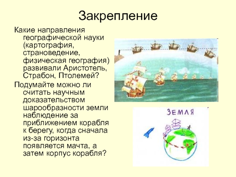 ЗакреплениеКакие направления географической науки (картография, страноведение, физическая география) развивали Аристотель, Страбон, Птолемей?Подумайте можно ли считать научным доказательством