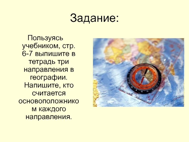 Задание:Пользуясь учебником, стр. 6-7 выпишите в тетрадь три направления в географии. Напишите, кто считается основоположником каждого направления.