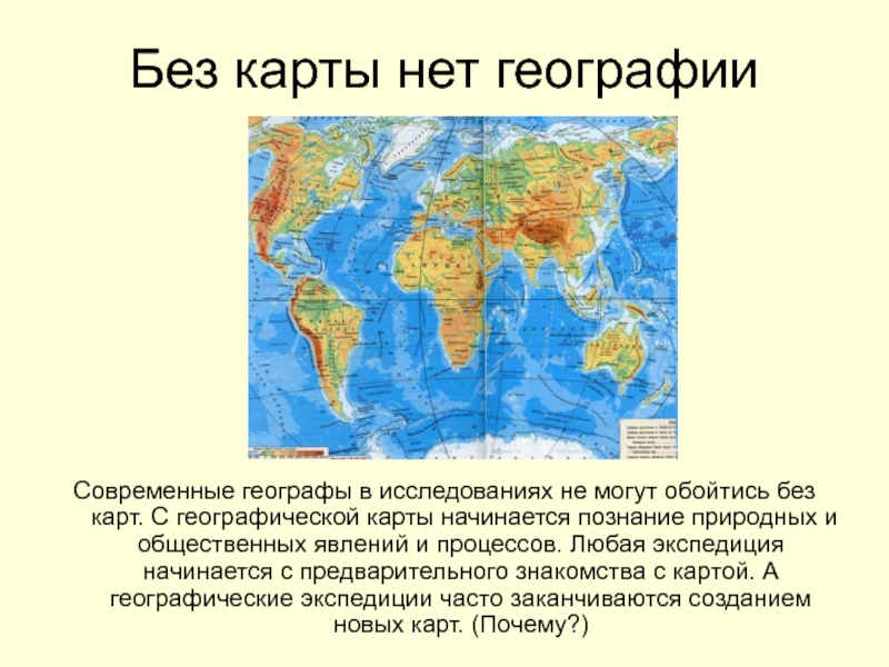 Без карты нет географииСовременные географы в исследованиях не могут обойтись без карт. С географической карты начинается познание