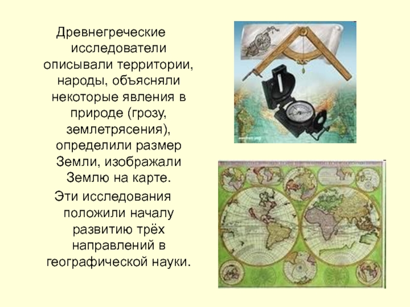 Древнегреческие исследователи описывали территории, народы, объясняли некоторые явления в природе (грозу, землетрясения), определили размер Земли, изображали Землю