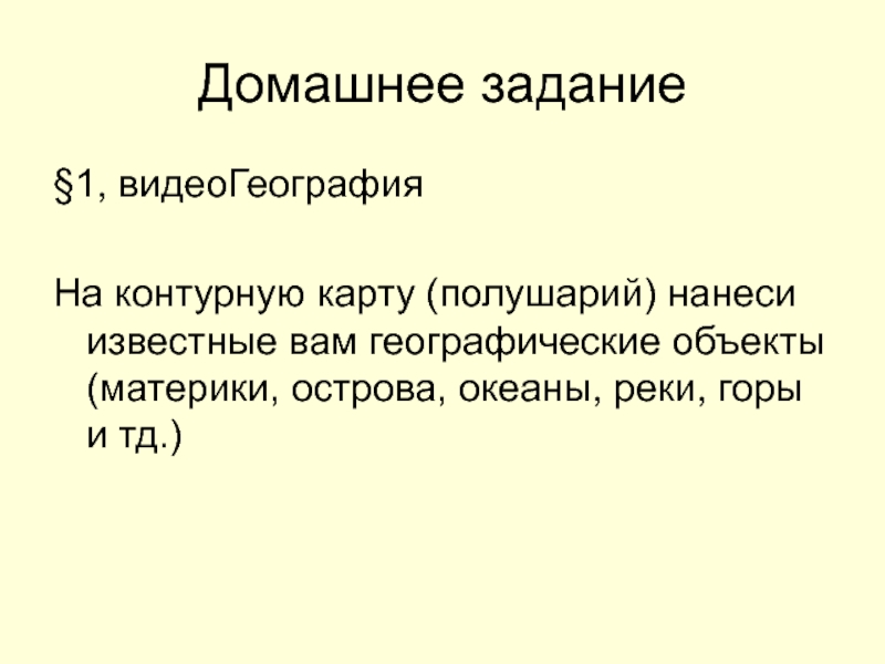 Домашнее задание§1, видеоГеографияНа контурную карту (полушарий) нанеси известные вам географические объекты (материки, острова, океаны, реки, горы и тд.)