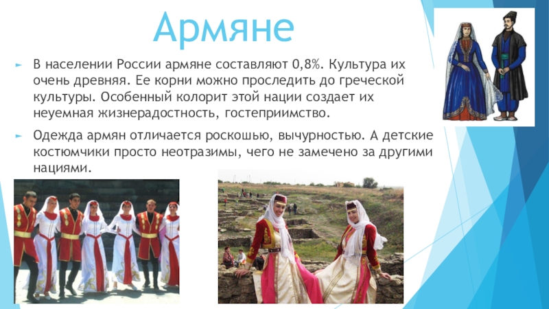 В населении России армяне составляют 0,8%. Культура их очень древняя. Ее