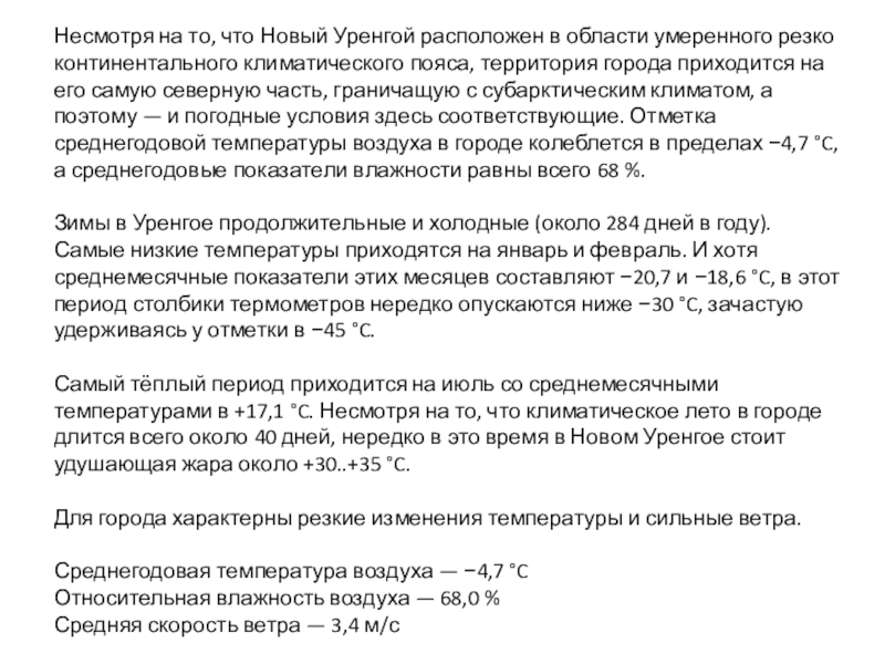 Слайд 8Несмотря на то, что Новый Уренгой расположен в области умеренного резко