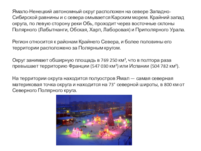 Слайд 4Ямало-Ненецкий автономный округ расположен на севере Западно-Сибирской равнины и с севера