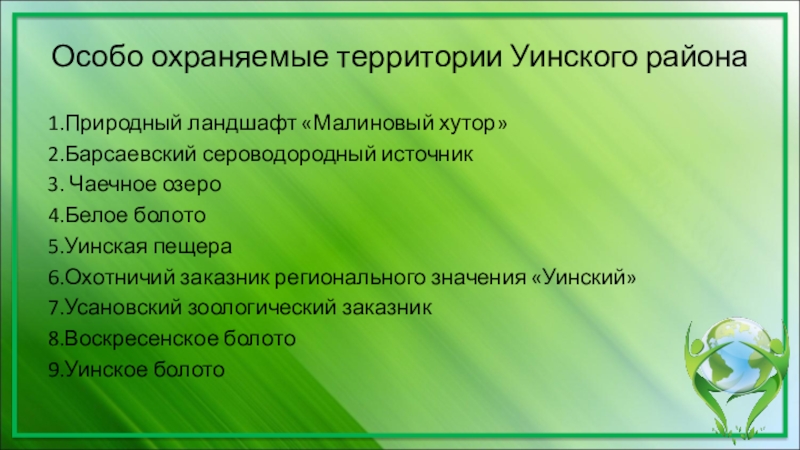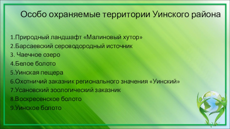 Особо охраняемые территории Уинского района1.Природный ландшафт «Малиновый хутор»2.Барсаевский сероводородный источник3. Чаечное озеро4.Белое болото5.Уинская пещера6.Охотничий заказник регионального значения