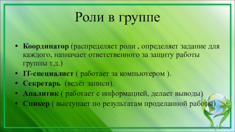 Роли в группеКоординатор (распределяет роли , определяет задание для каждого, назначает ответственного за защиту работы группы т.д.)IT-специалист