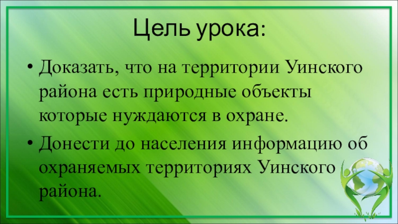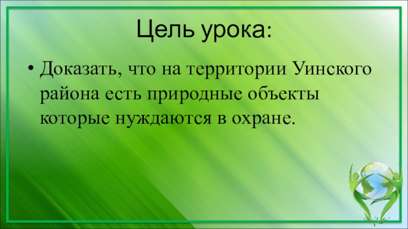 Цель урока:Доказать, что на территории Уинского района есть природные объекты которые нуждаются в охране.