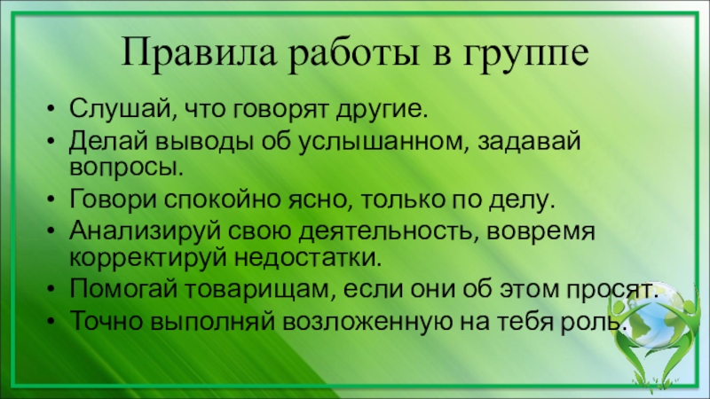 Правила работы в группеСлушай, что говорят другие.Делай выводы об услышанном, задавай вопросы.Говори спокойно ясно, только по делу.Анализируй
