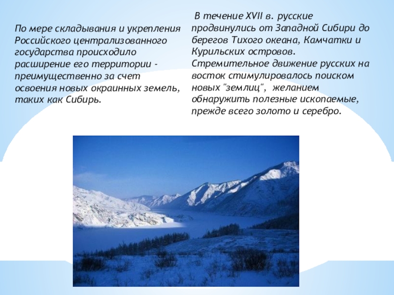 В течение XVII в. русские продвинулись от Западной Сибири до берегов Тихого океана, Камчатки и Курильских островов. Стремительное движение русских на восток стимулировалось поиском новых "землиц", желанием обнаружить полезные ископаемые, прежде всего золото и серебро.