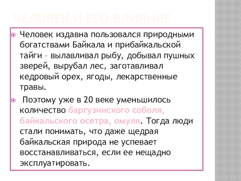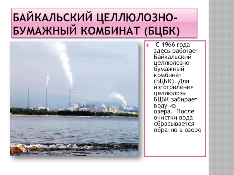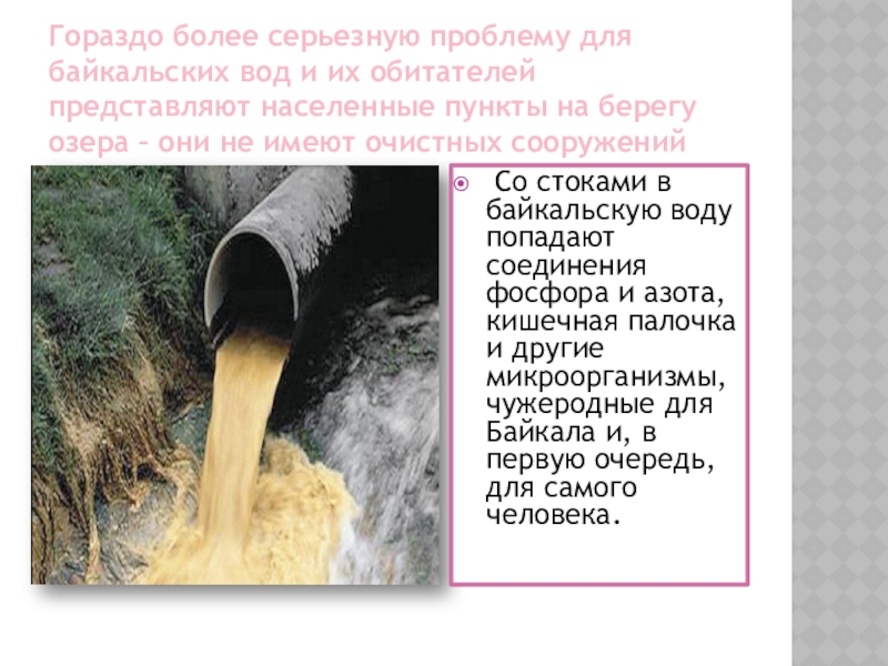 Со стоками в байкальскую воду попадают соединения фосфора и азота, кишечная палочка и другие микроорганизмы, чужеродные для Байкала и, в первую очередь, для самого человека.
