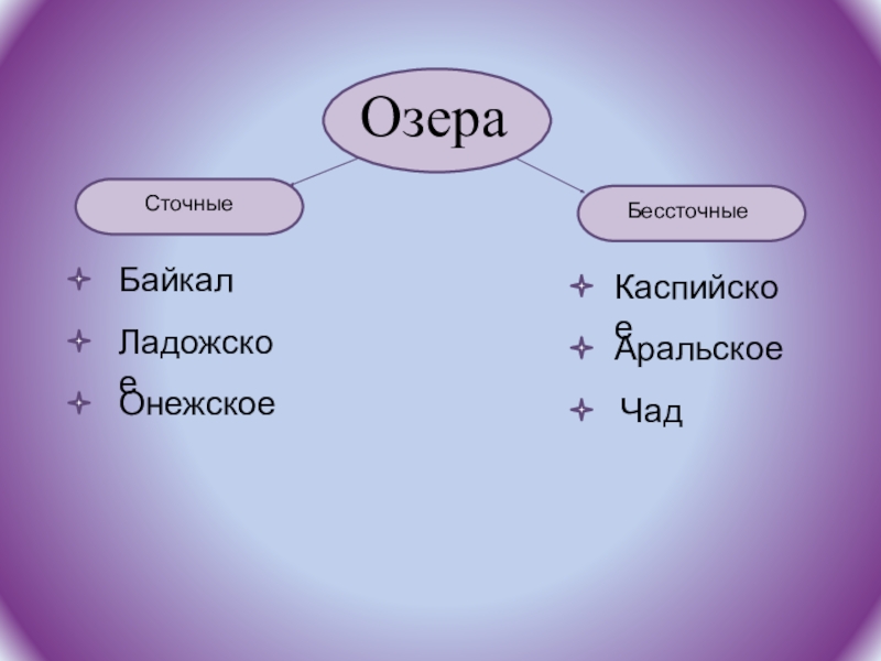 ОзераСточныеБессточныеБайкалКаспийскоеАральскоеЛадожскоеОнежское Чад