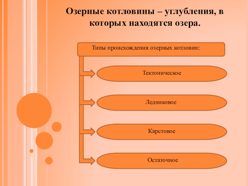 Озерные котловины – углубления, в которых находятся озера.Типы происхождения озерных котловин:Тектоническое ЛедниковоеКарстовоеОстаточное