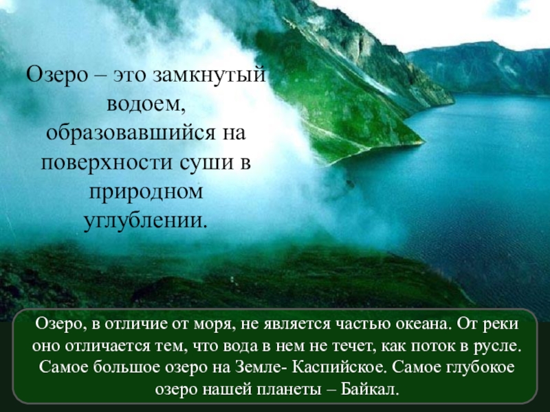 Озеро, в отличие от моря, не является частью океана. От реки оно отличается тем, что вода в нем не течет, как поток в русле. Самое большое озеро на Земле- Каспийское. Самое глубокое озеро нашей планеты – Байкал.