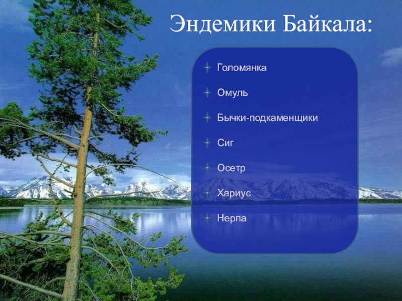 Эндемики Байкала:ГоломянкаОмульБычки-подкаменщикиСигОсетрХариусНерпа