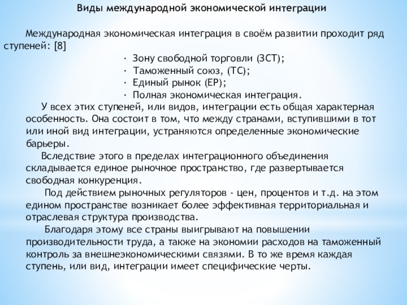 Благодаря этому все страны выигрывают на повышении производительности труда, а также на экономии расходов на таможенный контроль за внешнеэкономическими связями. В то же время каждая ступень, или вид, интеграции имеет специфические черты.