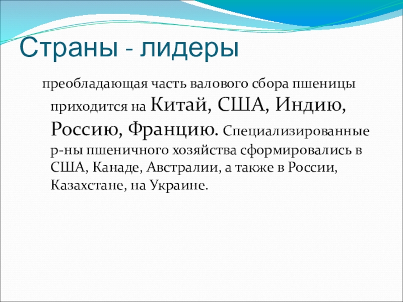 США, Индию, Россию, Францию. Специализированные р-ны пшеничного хозяйства сформировались в США, Канаде, Австралии, а также в России, Казахстане, на Украине.