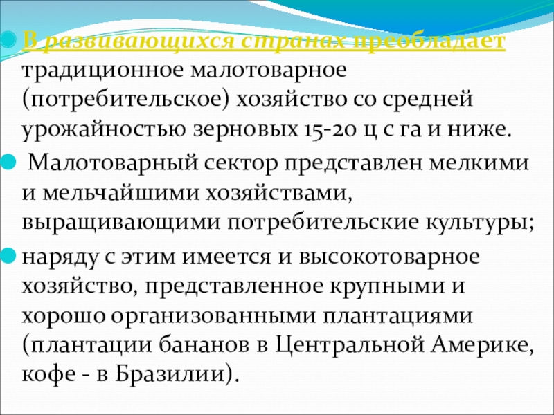 Слайд 10В развивающихся странах преобладает традиционное малотоварное (потребительское) хозяйство со средней урожайностью