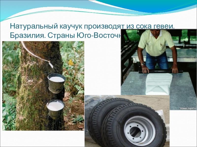 Слайд 47Натуральный каучук производят из сока гевеи. Бразилия. Страны Юго-Восточной Азии.