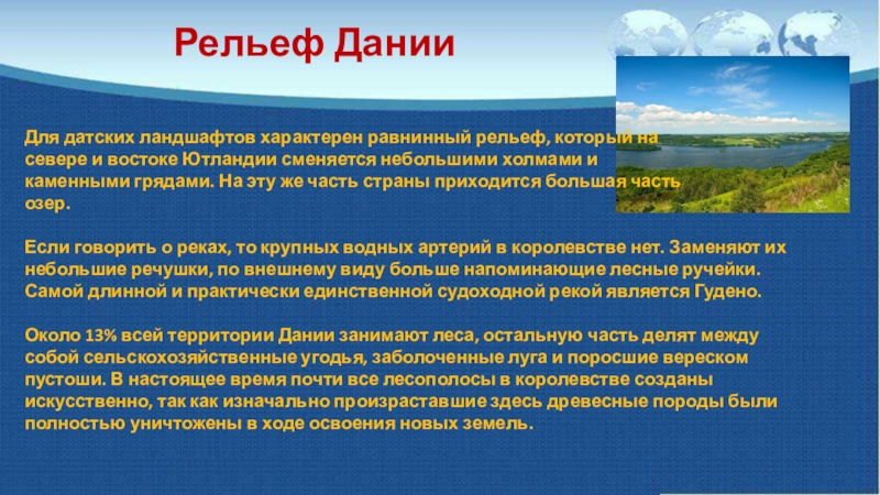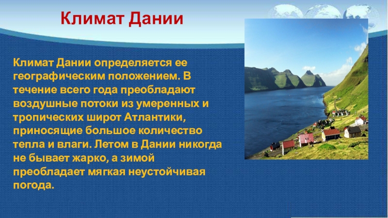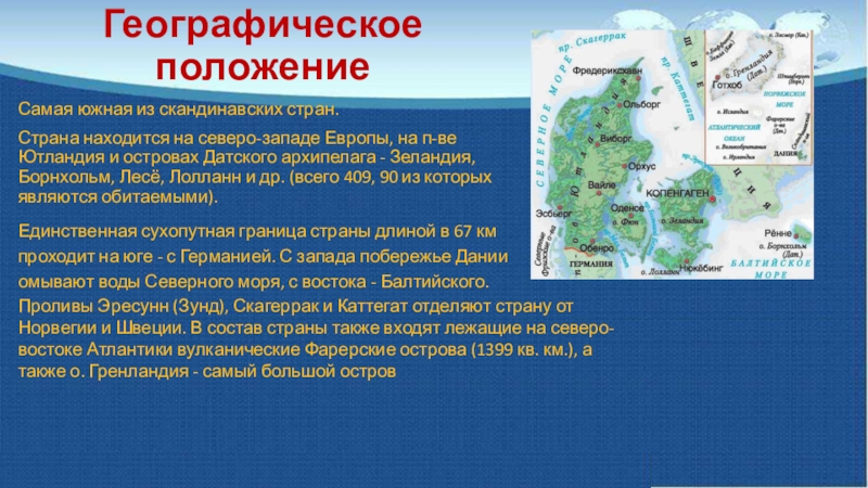 Проливы Эресунн (Зунд), Скагеррак и Каттегат отделяют страну от Норвегии и Швеции. В состав страны также входят лежащие на северо-востоке Атлантики вулканические Фарерские острова (1399 кв. км.), а также о. Гренландия - самый большой остров
