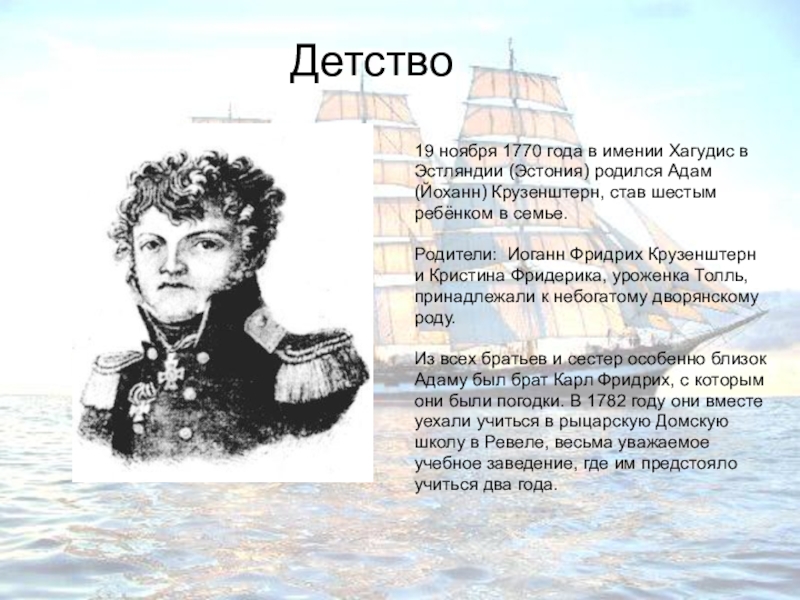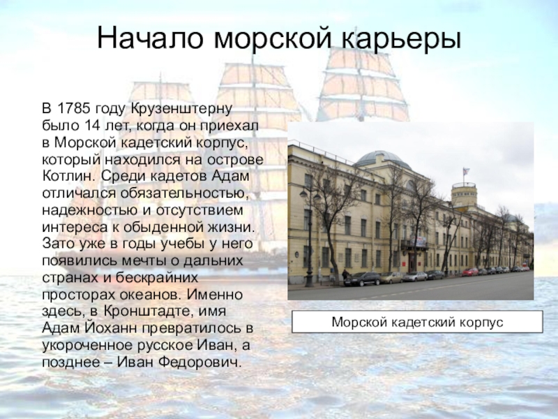 лет, когда он приехал в Морской кадетский корпус, который находился на острове Котлин. Среди кадетов Адам отличался обязательностью, надежностью и отсутствием интереса к обыденной жизни. Зато уже в годы учебы у него появились мечты о дальних странах и бескрайних просторах океанов. Именно здесь, в Кронштадте, имя Адам Йоханн превратилось в укороченное русское Иван, а позднее – Иван Федорович.