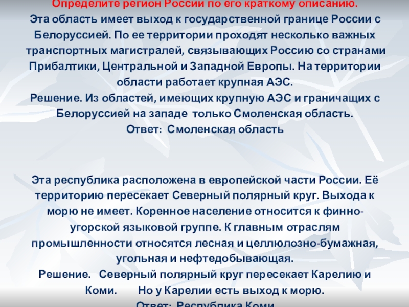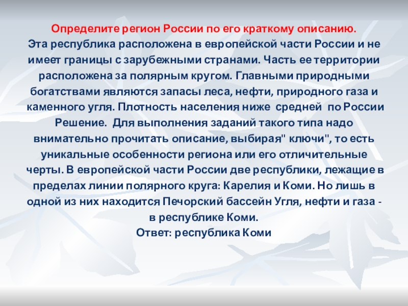 Решение. Для выполнения заданий такого типа надо внимательно прочитать описание, выбирая" ключи", то есть уникальные особенности региона или его отличительные черты. В европейской части России две республики, лежащие в пределах линии полярного круга: Карелия и Коми. Но лишь в одной из них находится Печорский бассейн Угля, нефти и газа -в республике Коми.