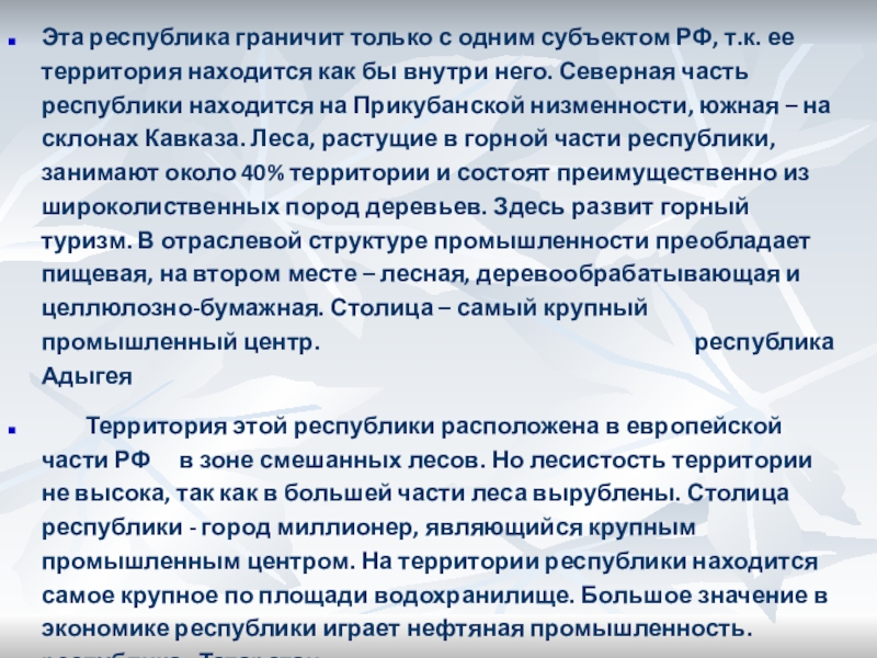 находится как бы внутри него. Северная часть республики находится на Прикубанской низменности, южная – на склонах Кавказа. Леса, растущие в горной части республики, занимают около 40% территории и состоят преимущественно из широколиственных пород деревьев. Здесь развит горный туризм. В отраслевой структуре промышленности преобладает пищевая, на втором месте – лесная, деревообрабатывающая и целлюлозно-бумажная. Столица – самый крупный промышленный центр. республика Адыгея