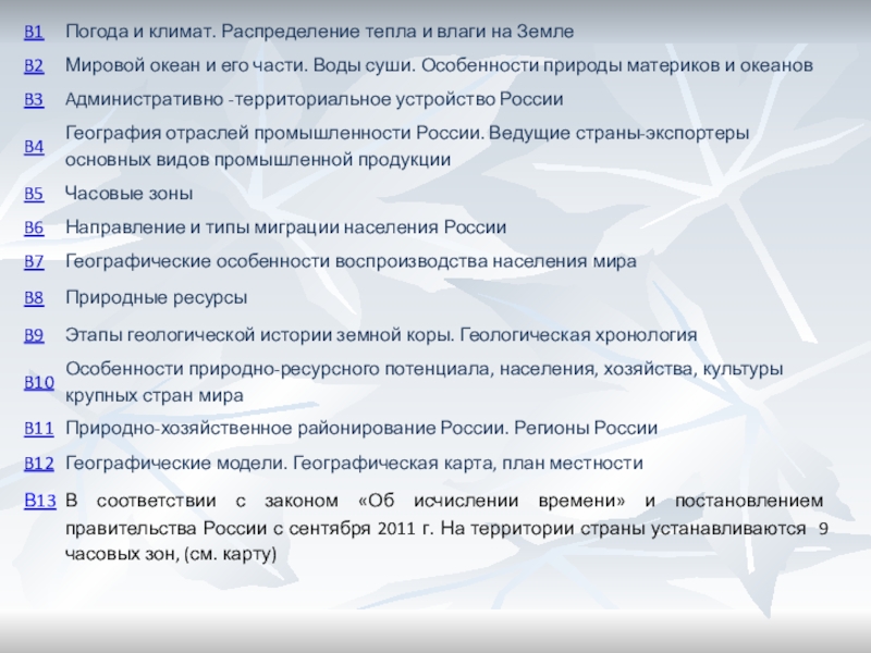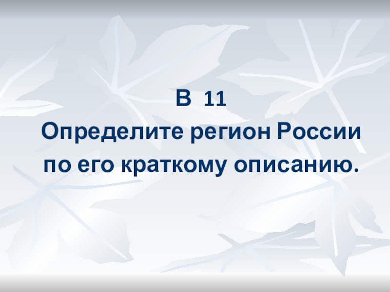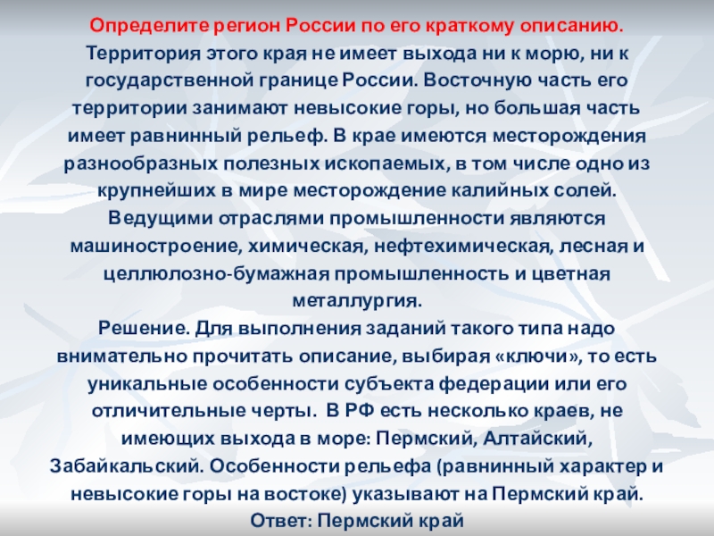 Решение. Для выполнения заданий такого типа надо внимательно прочитать описание, выбирая «ключи», то есть уникальные особенности субъекта федерации или его отличительные черты. В РФ есть несколько краев, не имеющих выхода в море: Пермский, Алтайский, Забайкальский. Особенности рельефа (равнинный характер и невысокие горы на востоке) указывают на Пермский край.
