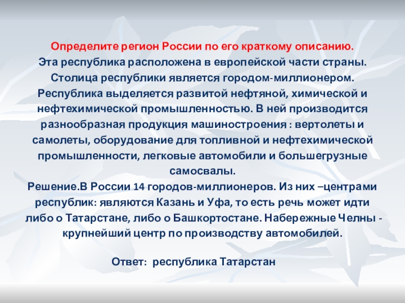 Решение.В России 14 городов-миллионеров. Из них –центрами республик: являются Казань и Уфа, то есть речь может идти либо о Татарстане, либо о Башкортостане. Набережные Челны - крупнейший центр по производству автомобилей.