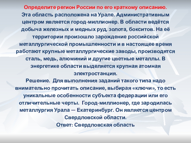 Решение. Для выполнения заданий такого типа надо внимательно прочитать описание, выбирая «ключи», то есть уникальные особенности субъекта федерации или его отличительные черты. Город-миллионер, где зародилась металлургия Урала — Екатеринбург. Он является центром Свердловской области.