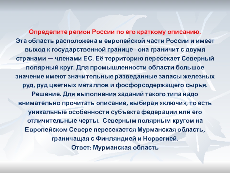 Решение. Для выполнения заданий такого типа надо внимательно прочитать описание, выбирая «ключи», то есть уникальные особенности субъекта федерации или его отличительные черты. Северным полярным кругом на Европейском Севере пересекается Мурманская область, граничащая с Финляндией и Норвегией.