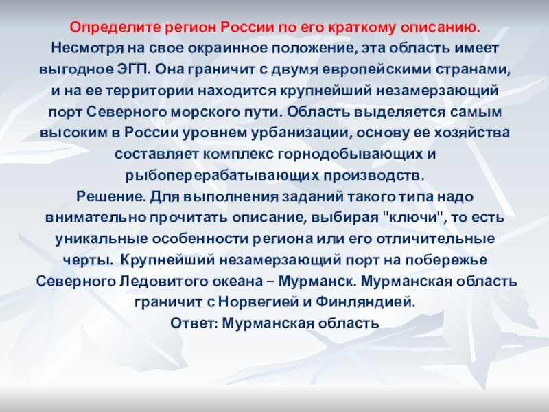 Решение. Для выполнения заданий такого типа надо внимательно прочитать описание, выбирая "ключи", то есть уникальные особенности региона или его отличительные черты. Крупнейший незамерзающий порт на побережье Северного Ледовитого океана – Мурманск. Мурманская область граничит с Норвегией и Финляндией.