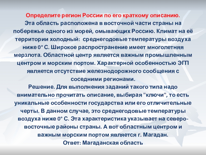 Решение. Для выполнения заданий такого типа надо внимательно прочитать описание, выбирая "ключи", то есть уникальные особенности государства или его отличительные черты. В данном случае, это среднегодовые температуры воздуха ниже 0° С. Эта характеристика указывает на северо-восточные районы страны. А вот областным центром и важным морским портом является г. Магадан.