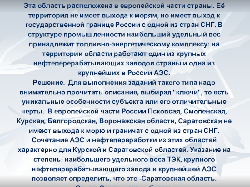 Решение. Для выполнения заданий такого типа надо внимательно прочитать описание, выбирая "ключи", то есть уникальные особенности субъекта или его отличительные черты. В европейской части России Псковсая, Смоленская, Курская, Белгородская, Воронежская области, Саратовская не имеют выхода к морю и граничат с одной из стран СНГ. Сочетание АЭС и нефтепереработки из этих областей характерно для Курской и Саратовской областей. Указание на степень: наибольшего удельного веса ТЭК, крупного нефтеперерабатывающего завода и крупнейшей АЭС позволяет определить, что это -Саратовская область.