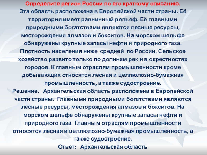 Решение. Для выполнения заданий такого типа надо внимательно прочитать описание, выбирая "ключи", то есть уникальные особенности региона или его отличительные черты. В данном случае, это площадь области. Две области на европейском севере имеют и выходы к морям, и месторождения бокситов, и развитый лесопромышленный комплекс. Это Мурманская и Архангельская области. Но по площади крупнейшей является Архангельская область.