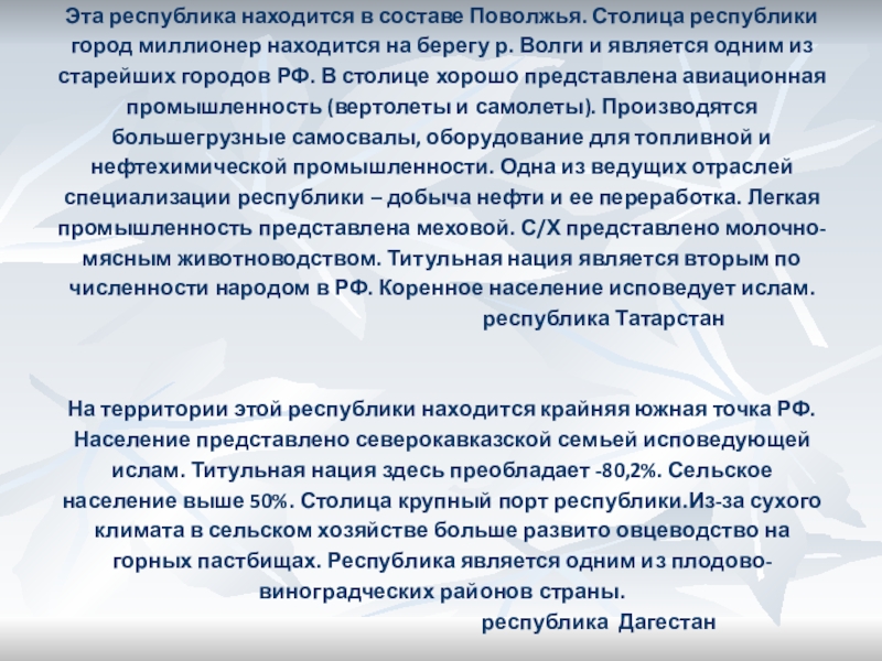 на берегу р. Волги и является одним из старейших городов РФ. В столице хорошо представлена авиационная промышленность (вертолеты и самолеты). Производятся большегрузные самосвалы, оборудование для топливной и нефтехимической промышленности. Одна из ведущих отраслей специализации республики – добыча нефти и ее переработка. Легкая промышленность представлена меховой. С/Х представлено молочно-мясным животноводством. Титульная нация является вторым по численности народом в РФ. Коренное население исповедует ислам.