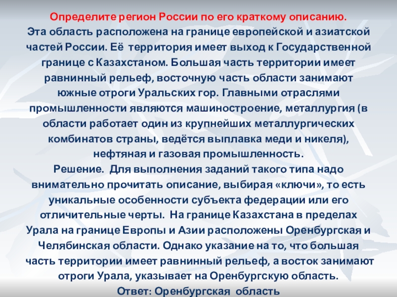 Решение. Для выполнения заданий такого типа надо внимательно прочитать описание, выбирая «ключи», то есть уникальные особенности субъекта федерации или его отличительные черты. На границе Казахстана в пределах Урала на границе Европы и Азии расположены Оренбургская и Челябинская области. Однако указание на то, что большая часть территории имеет равнинный рельеф, а восток занимают отроги Урала, указывает на Оренбургскую область.