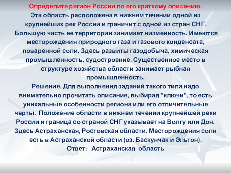Решение. Для выполнения заданий такого типа надо внимательно прочитать описание, выбирая "ключи", то есть уникальные особенности региона или его отличительные черты. Положение области в нижнем течении крупнейшей реки России и граница со страной СНГ указывает на Волгу или Дон. Здесь Астраханская, Ростовская области. Месторождения соли есть в Астраханской области (оз. Баскунчак и Эльтон).