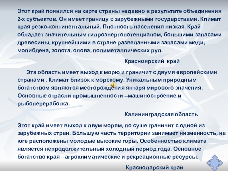 Слайд 29Этот край появился на карте страны недавно в результате объединения 2-х субъектов. Он