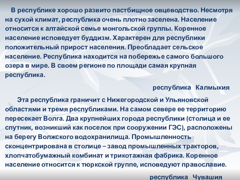 Эта республика граничит с Нижегородской и Ульяновской областями и тремя республиками. На самом севере ее территорию пересекает Волга. Два крупнейших города республики (столица и ее спутник, возникший как поселок при сооружении ГЭС), расположены на берегу Волжского водохранилища. Промышленность сконцентрирована в столице – завод промышленных тракторов, хлопчатобумажный комбинат и трикотажная фабрика. Коренное население относится к тюркской группе, исповедуют православие.