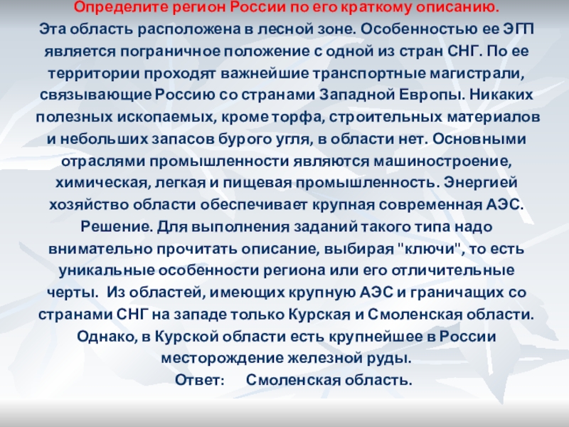 Решение. Для выполнения заданий такого типа надо внимательно прочитать описание, выбирая "ключи", то есть уникальные особенности региона или его отличительные черты. Из областей, имеющих крупную АЭС и граничащих со странами СНГ на западе только Курская и Смоленская области. Однако, в Курской области есть крупнейшее в России месторождение железной руды.