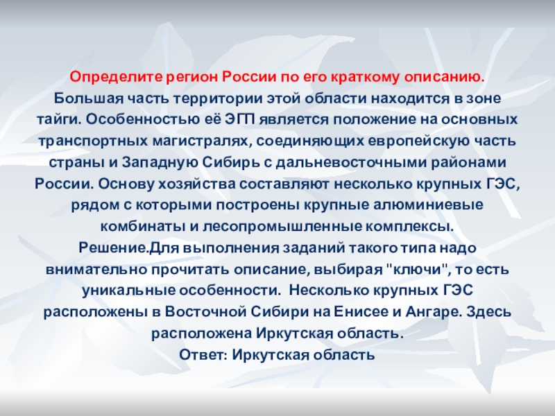Решение.Для выполнения заданий такого типа надо внимательно прочитать описание, выбирая "ключи", то есть уникальные особенности. Несколько крупных ГЭС расположены в Восточной Сибири на Енисее и Ангаре. Здесь расположена Иркутская область.