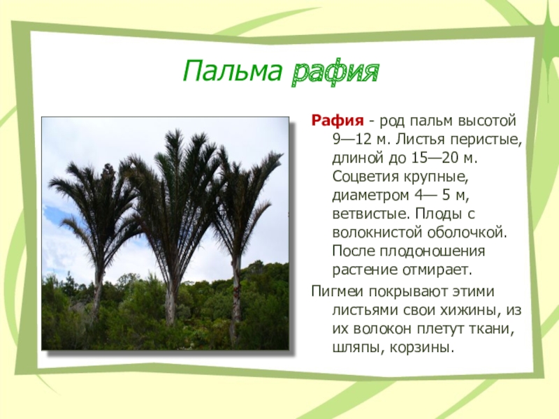 Рафия - род пальм высотой 9—12 м. Листья перистые, длиной