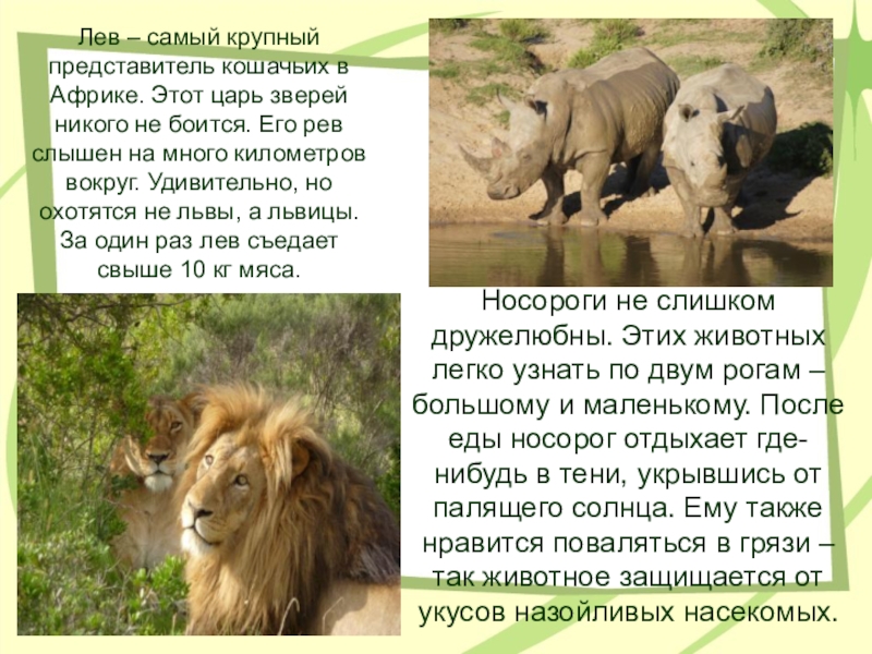 Лев – самый крупный представитель кошачьих в Африке. Этот царь зверей никого не боится. Его рев слышен на много километров вокруг. Удивительно, но охотятся не львы, а львицы. За один раз лев съедает свыше 10 кг мяса.