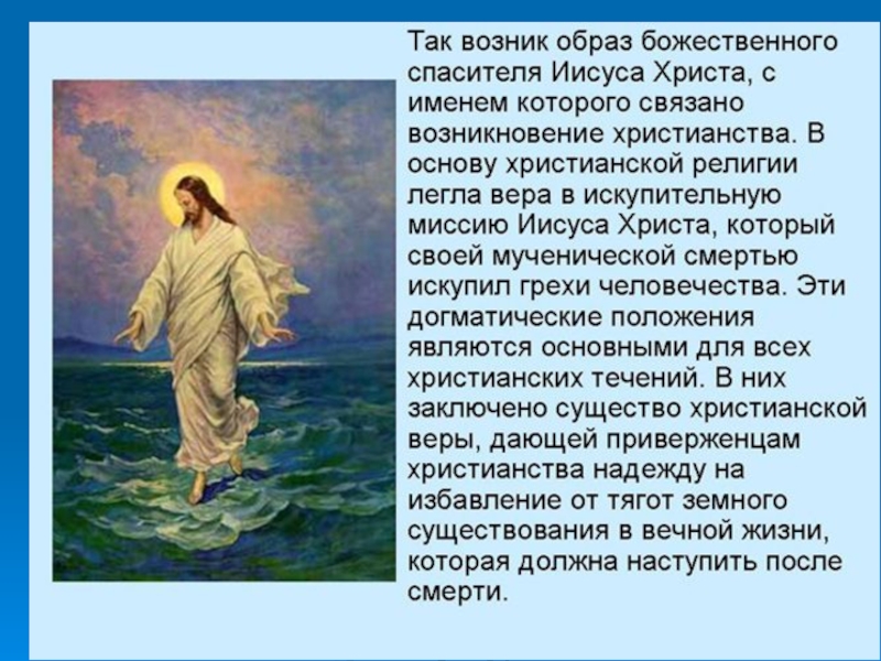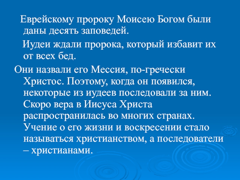 Они назвали его Мессия, по-гречески Христос. Поэтому, когда он появился, некоторые из иудеев последовали за ним. Скоро вера в Иисуса Христа распространилась во многих странах. Учение о его жизни и воскресении стало называться христианством, а последователи – христианами.